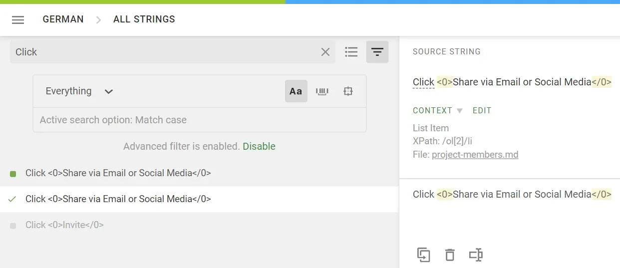 • Duplicate strings are visible along with master strings when applying the Translation Updated filter.